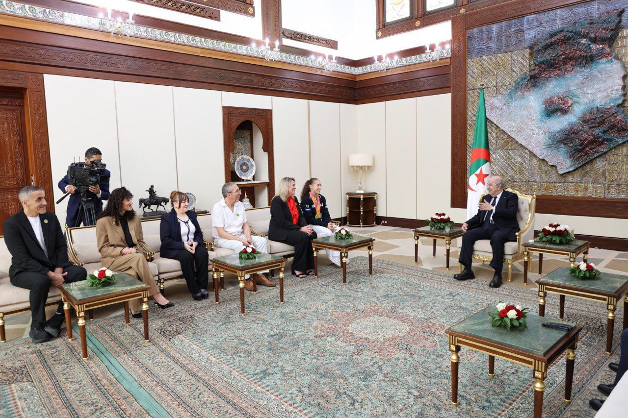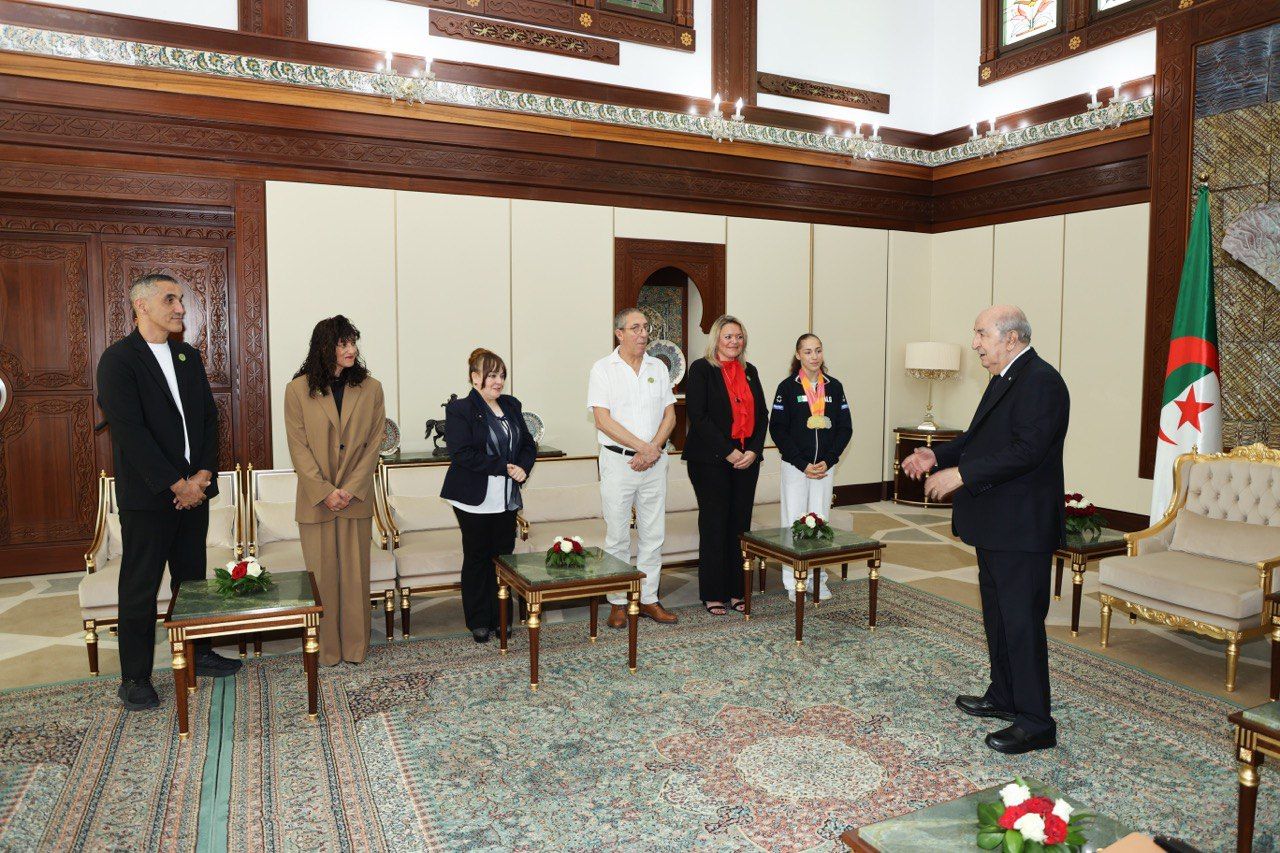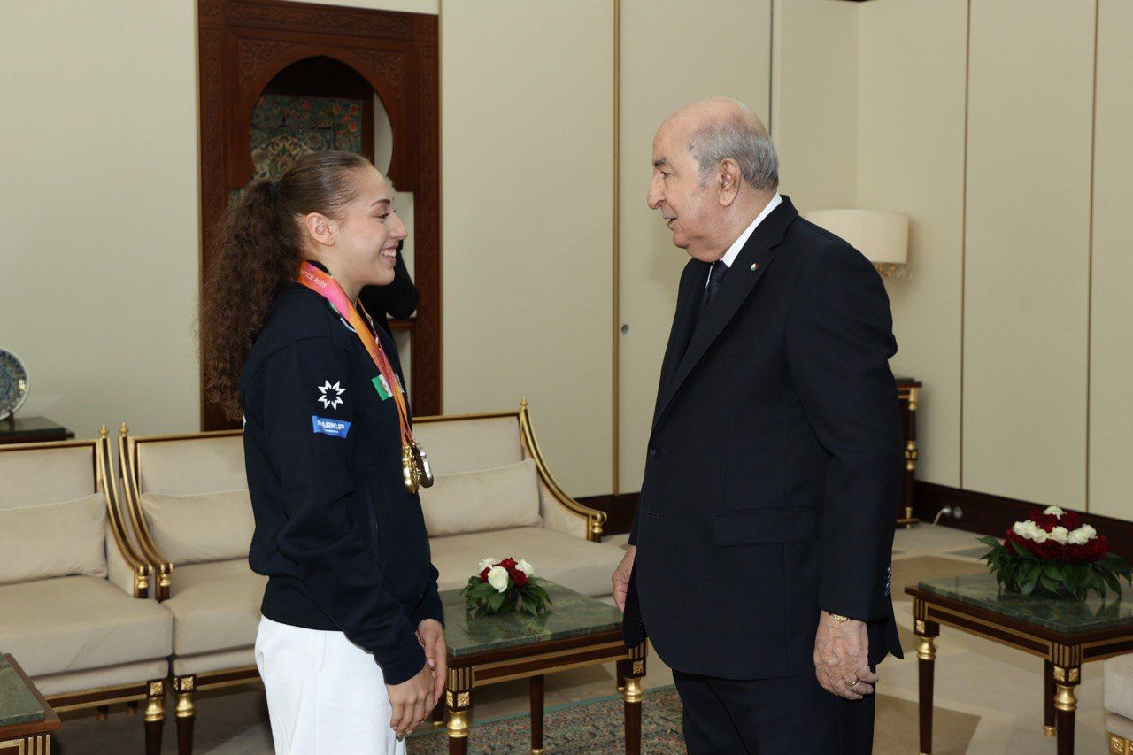 استقبل رئيس الجمهورية، السيد عبد المجيد تبون، اليوم، البطلة الأولمبية والعالمية كيليا نمور رفقة والديها والطاقم الفني والتقني لفيدرالية الجمباز.
